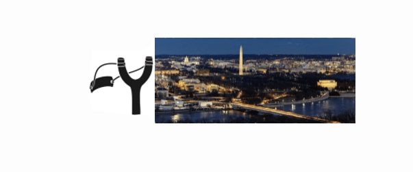 Mars is a master at using a slingshot and in the two-picture website icon his slingshot is aimed at a picture of Washington DC, where The Twins are located. In short, he is aiming at his community– symbolically zeroing in to target the local news of the day.